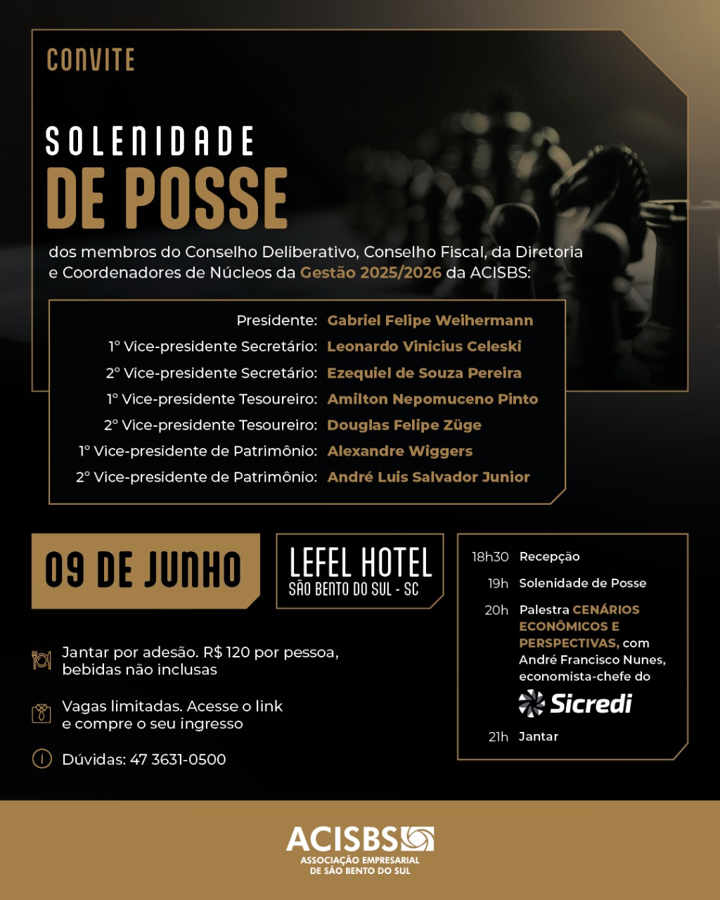A Associação Empresarial de São Bento do Sul (Acisbs) convida para a solenidade de posse dos novos membros do Conselho Deliberativo, Conselho Fiscal, Diretoria e Coordenadores de Núcleos, gestão 2025/2026. O evento está marcado para o dia 9 de junho, às 19h, no Lefel Hotel. Será uma noite especial de confraternização entre os associados, empresários e lideranças locais.