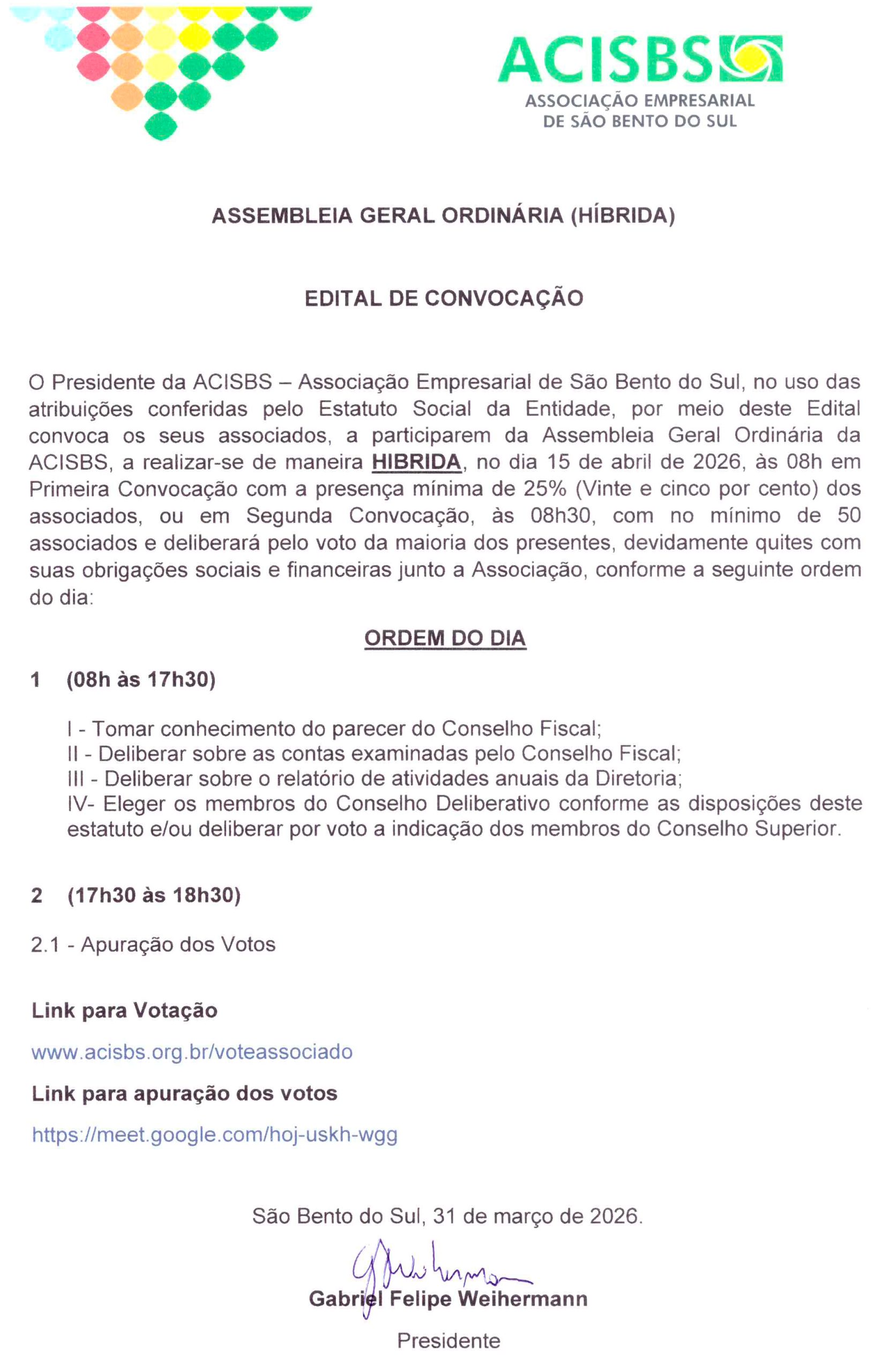 No dia 15 de abril, acontece a Assembleia Geral Ordinária da Associação Empresarial de São Bento do Sul (Acisbs), que será realizada de maneira híbrida às 8h em primeira convocação, com a presença de pelo menos 25% dos associados e 8h30 em segunda convocação, caso não seja atingido o quórum inicial.